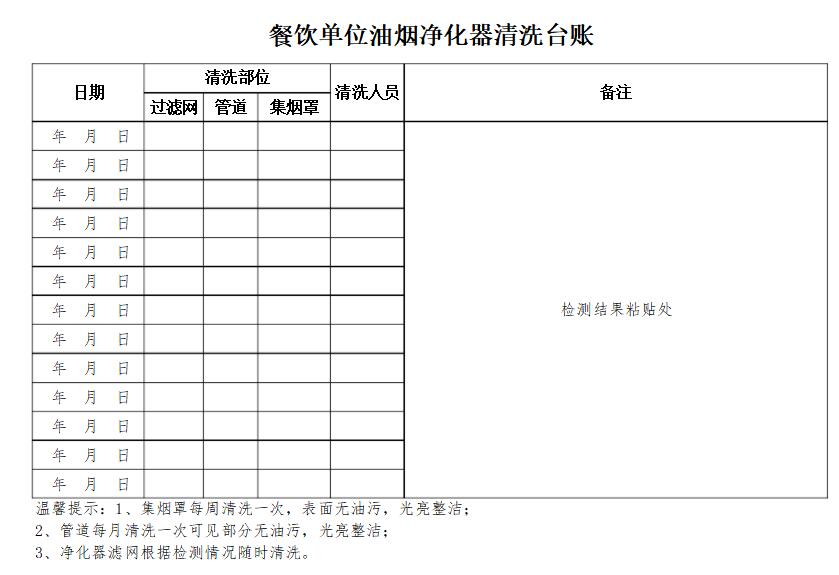 油煙凈化器清洗記錄表格,廚房油煙凈化器目前已走入越來越多的家庭,逐步成為廚房必須品之一。但是對于油煙凈化器的清潔維護方面,廣大用戶還存在諸多不足,為了保障用戶的使用效果和安全,油煙凈化器必須清洗。